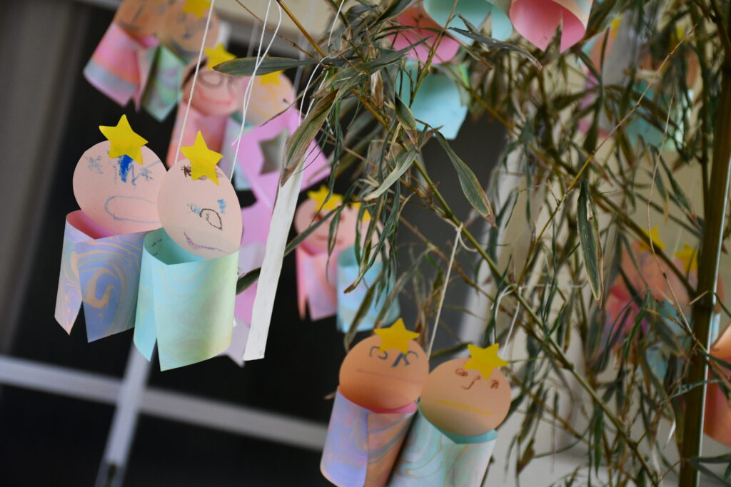 先日から七夕かざりを子どもたちと作り始め、 お願いごとの短冊もたくさん飾っていただきました。ありがとうございました。 みんなの願い事かなうといいですね。 今日は一年に1回、あまの川で織姫と彦星が出会える日。 七夕の由来を子どもたちに伝え、い... -
