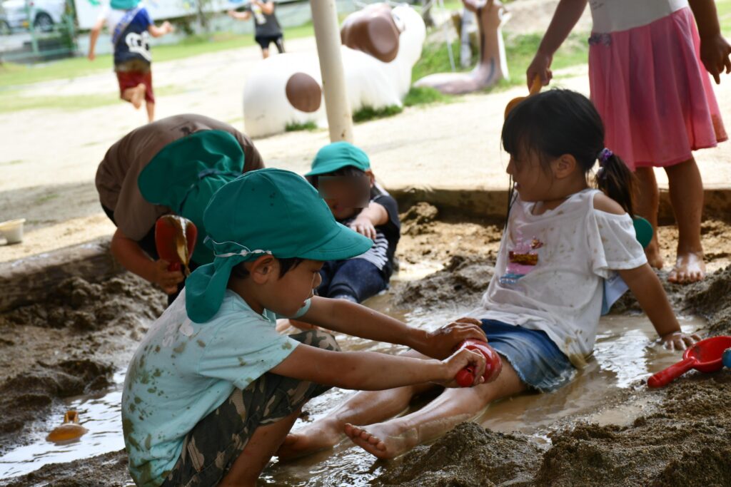 1.2歳児さんもどろあそびデビューしました。 はじめは恐る恐る砂場に近づいていく慎重派の子どもいましたが みんなが楽しそうにしている姿に触発され触れてみようとする子も! -