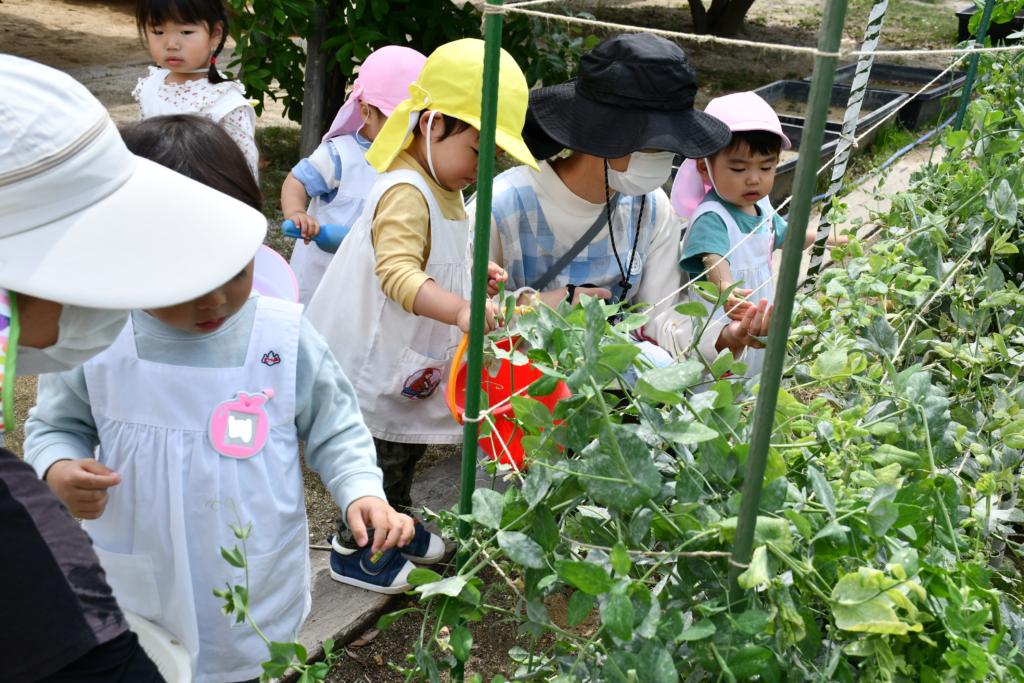 今日はとてもいいお天気だったので畑で育てていたスナップエンドウを収穫しました。 園長先生の掛け声とともに一斉に収穫スタートです。 実が大きくプリプリで食べごろのスナップエンドウを子どもたちが上手に見つけてくれ、あっという間にザルいっぱいに... -